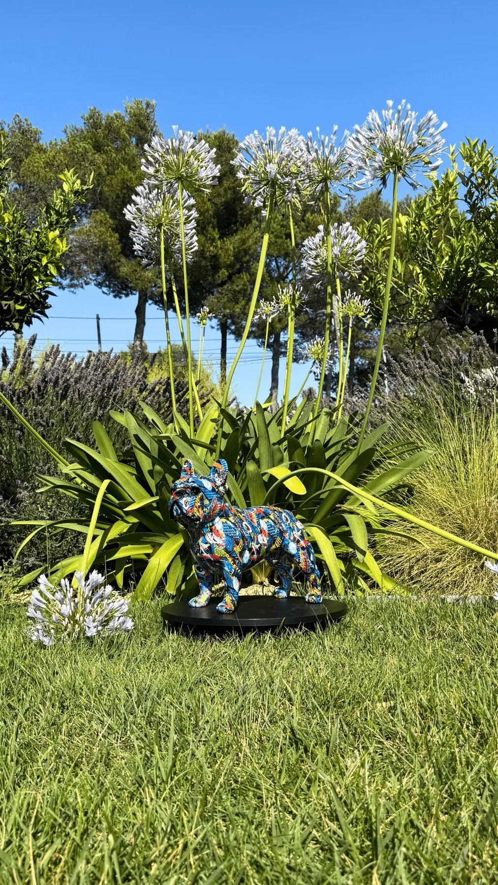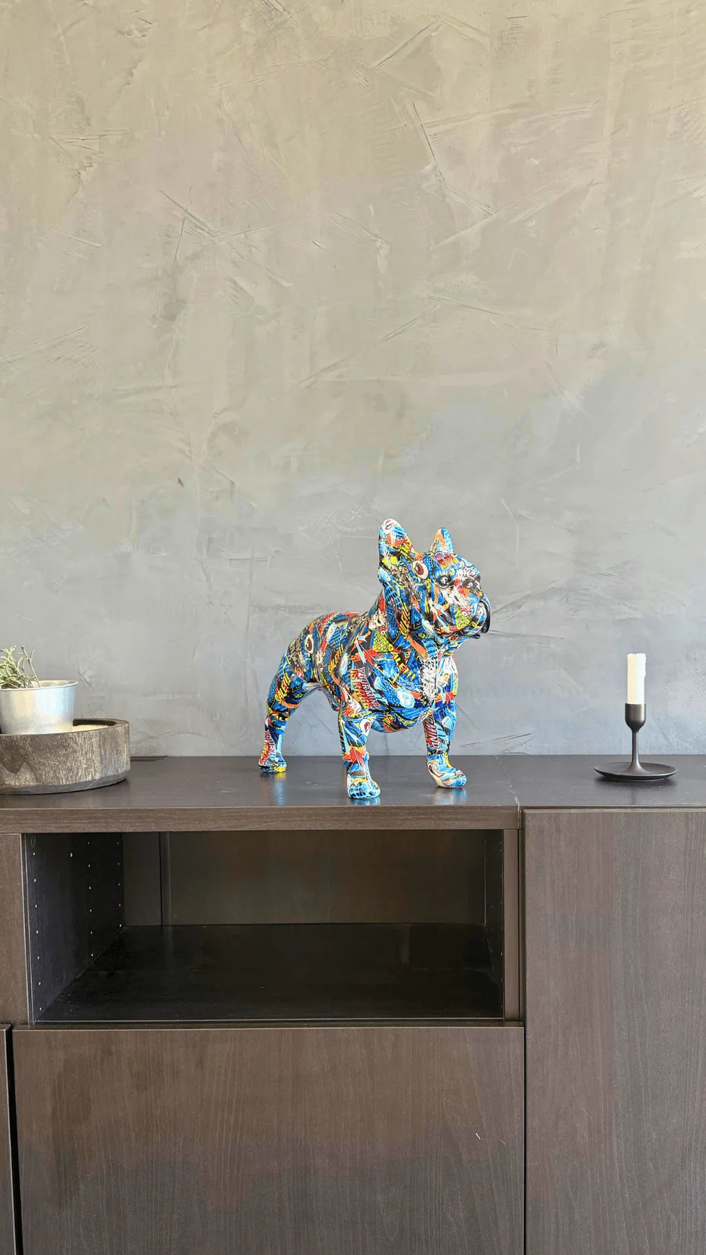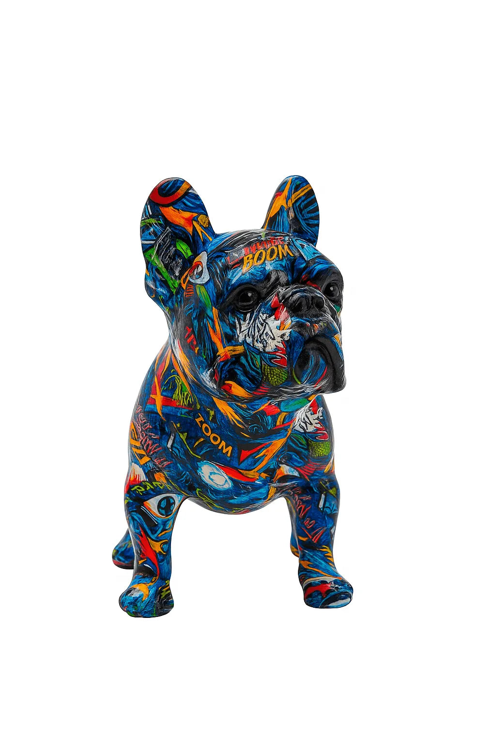 Bring a dose of energy and urban art into your home with this explosive-looking French bulldog statue . Covered in multicolored paint splashes (red, yellow, blue, orange, green, etc.), this dog with an expressive gaze displays an aesthetic somewhere between street art and abstract pop art .