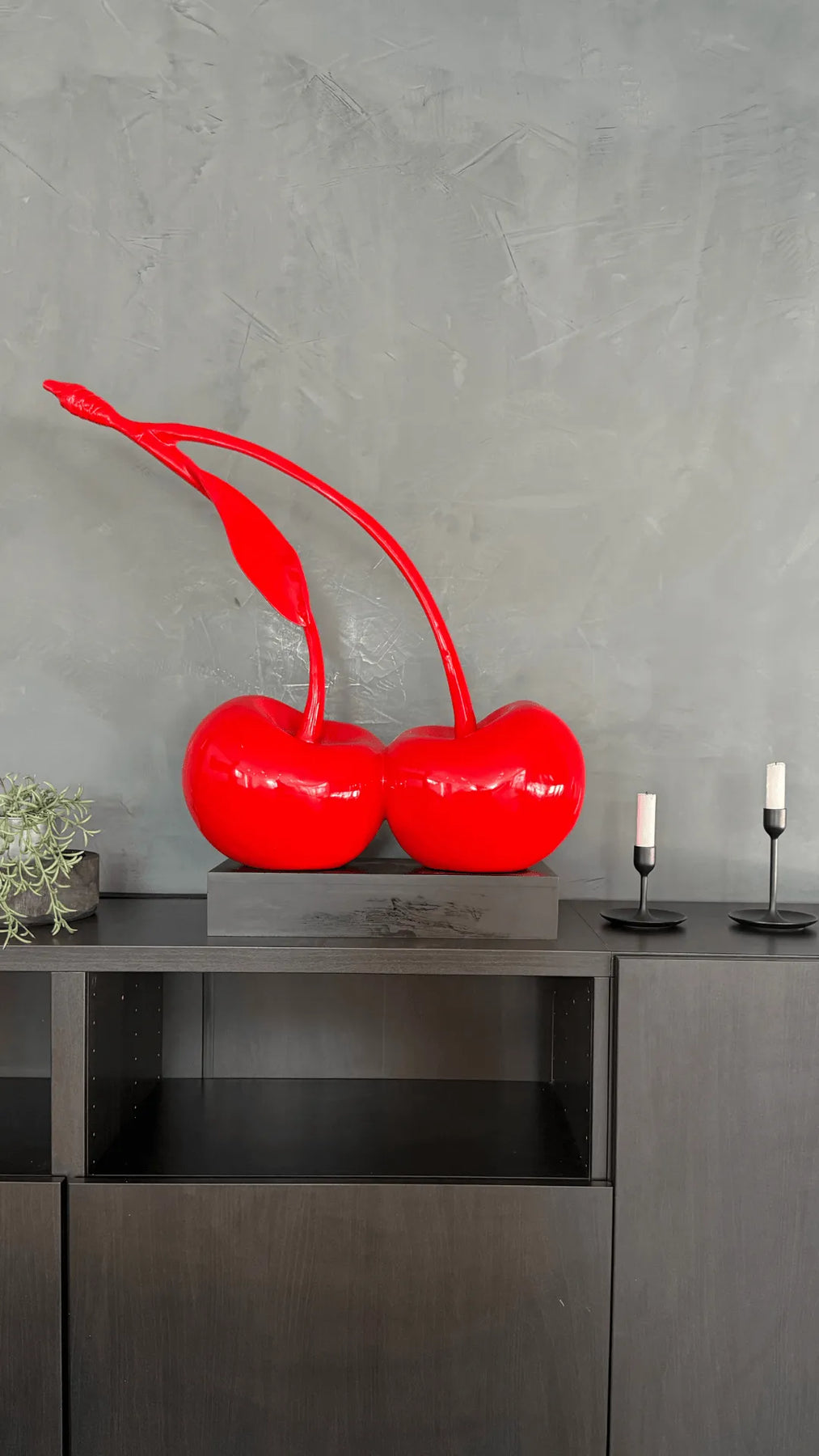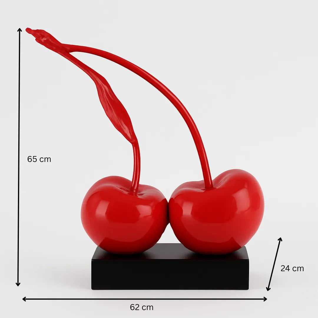 Dale un toque afrutado, elegante y audaz a tu interior con esta estilizada estatua de cereza , esculpida en resina brillante. Las dos cerezas, perfectamente redondas y de un rojo intenso , están unidas por tallos arqueados, uno de los cuales termina en una hoja delicadamente detallada . El conjunto reposa sobre una base rectangular negra que realza la silueta y las sensuales curvas de la pieza.